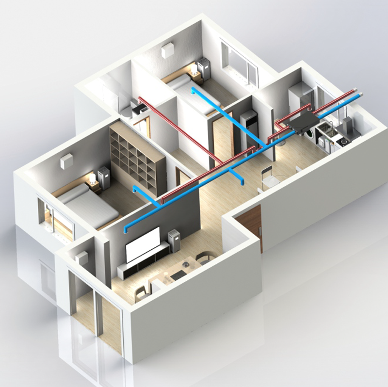 極簡(jiǎn)中央管道式雙向流新風(fēng)系統(tǒng)內(nèi)有獨(dú)立的送風(fēng)、排風(fēng)和過(guò)濾單元。送風(fēng)單元通過(guò)安裝在室外進(jìn)風(fēng)口并經(jīng)由送風(fēng)管將室外空氣導(dǎo)入過(guò)濾單元凈化后進(jìn)入室內(nèi)的臥室、書房、客廳排風(fēng)通過(guò)安裝在廚房、衛(wèi)生間的排風(fēng)口并經(jīng)由排風(fēng)管道將室內(nèi)空氣排出。